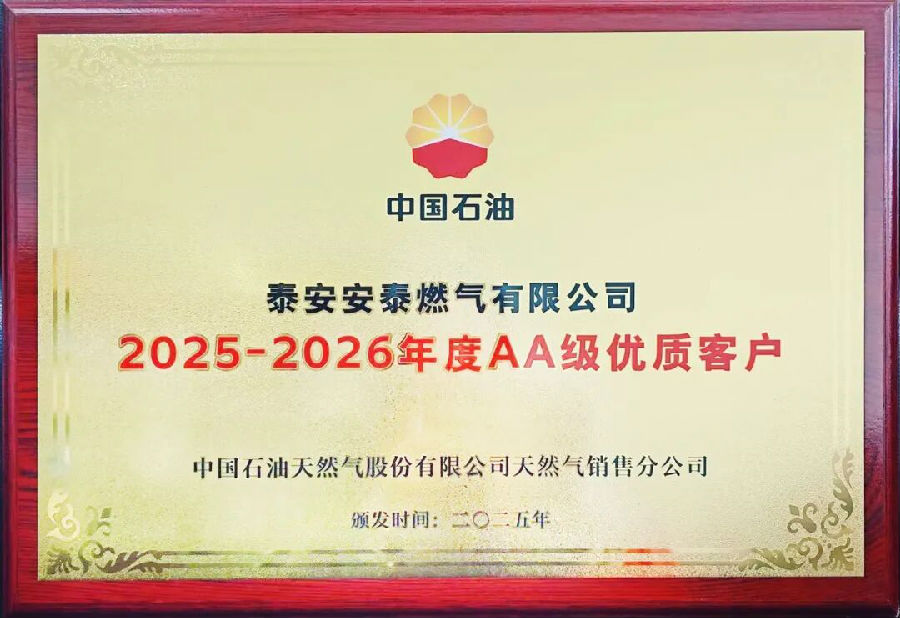 近日,泰安安泰燃氣有限公司被中國石油天然氣股份有限公司天然氣銷售分公司授予“2025—2026年度AA級優(yōu)質客戶”榮譽稱號。該榮譽是中國石油對合作企業(yè)的高度認可,更是對公司長期以來深耕能源保障、恪守契約精神、積極履行社會責任的權威肯定。