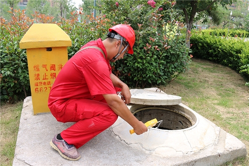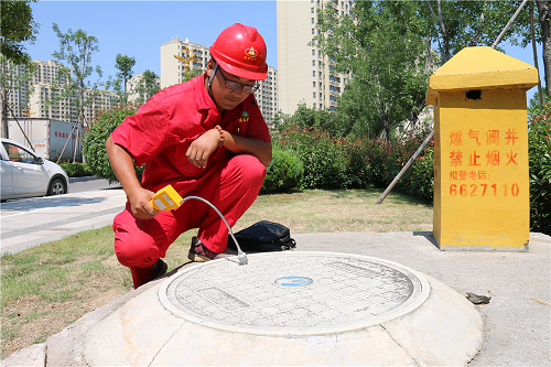 “巡線員查漏主要靠檢漏儀,巡檢過程中主要檢查是否有閥門漏氣、管道漏氣?!睆男^(qū)出來,宋緒全來到一個燃氣閥井前,將檢漏儀的金屬探頭通過預(yù)留孔伸進井下進行檢測。檢測完后,他又用隨身帶著的鐵拉鉤將井蓋拉開,檢查里面的設(shè)施運行情況。宋緒全一直在不停地拉井蓋和彎腰檢查燃氣設(shè)施,衣服上的汗堿已經(jīng)一層接一層,豆大的汗珠順著臉往下掉。