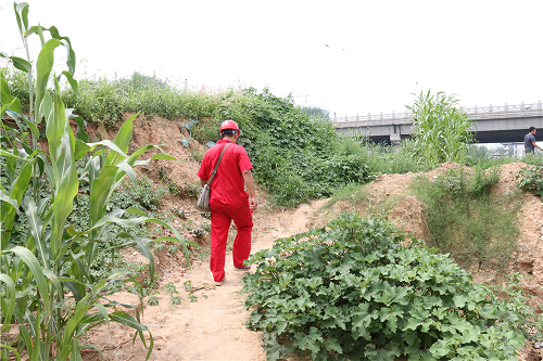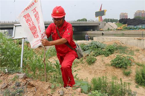 讓巡線員最不放心的,就是隨處可見的施工工地。盡管他們會與工地方主動聯(lián)系,給施工方提供燃氣管道位置、走向及埋深,并在現(xiàn)場監(jiān)護,但是總有一些施工單位不重視,私自開挖、野蠻施工,這也是導致天然氣泄漏的主要原因。在泮河河道改造現(xiàn)場,由于現(xiàn)場開挖涉及燃氣管道安全,宋緒全對管道上方做警示標識,并一再叮囑現(xiàn)場施工管理人員,尤其挖掘機司機注意管道安全,防止施工機械對燃氣管道造成損壞。因各類施工繁多,巡線的工作重心就側(cè)重于施工現(xiàn)場巡查及監(jiān)護,“白加黑,五加二”的模式,在他眼中看來是再尋常不過的事。從去年開始,他們還專門對警示樁進行了補栽。